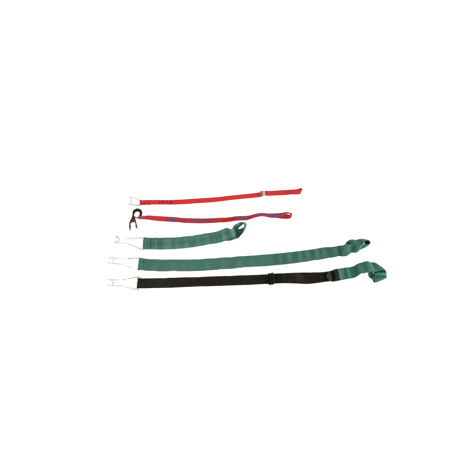 - Red textile roll container strap with Rolls Rapides branding and plastic hook