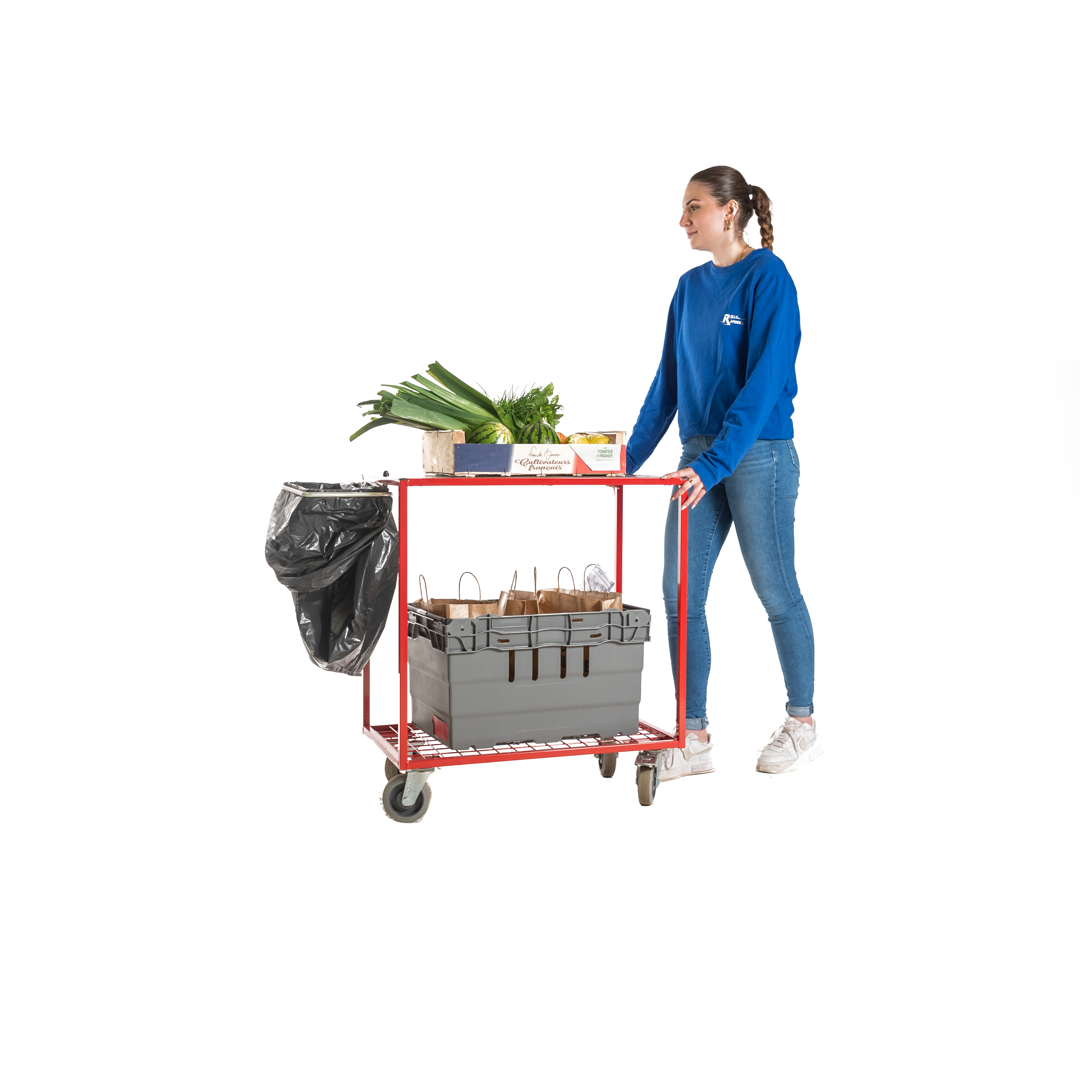 - Equipé de 4 roues pivotantes dont 2 à frein Ø 100 mm silencieuses et non traçantes à bandage